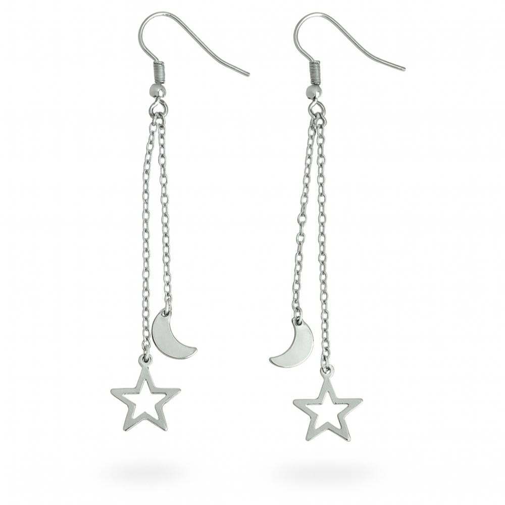 Shine day and night with these celestial-inspired earrings. Featuring delicate silver chains with dangling crescent moons and stars, they capture the beauty of the night sky in an elegant and modern design—perfect for adding a dreamy touch to your look.