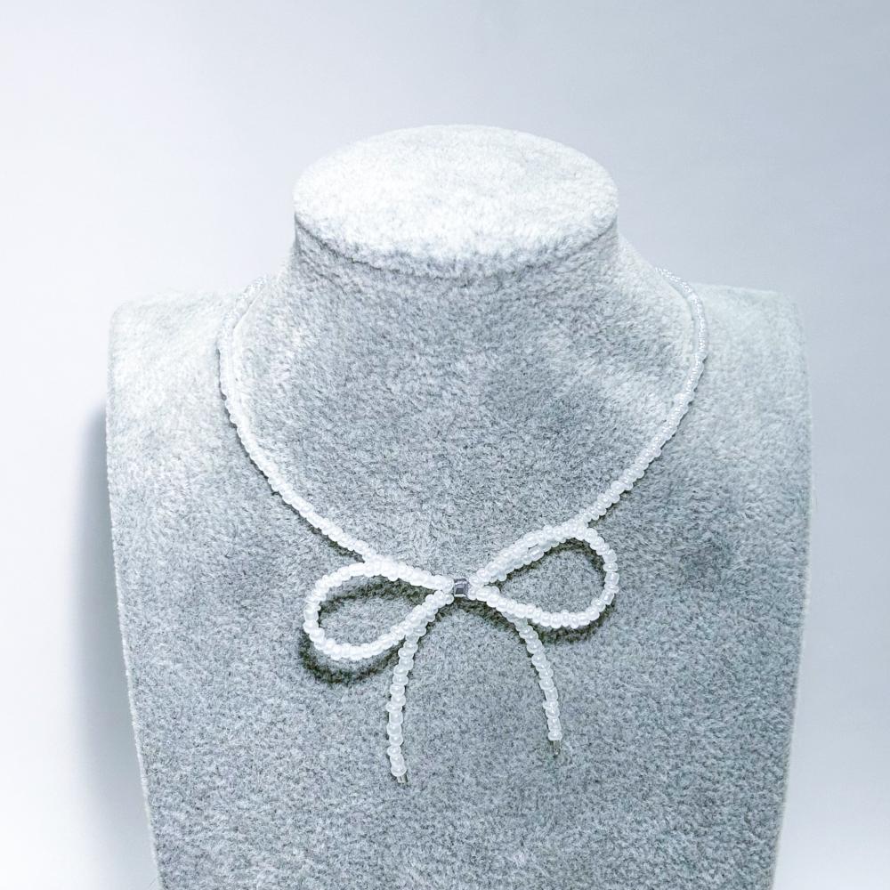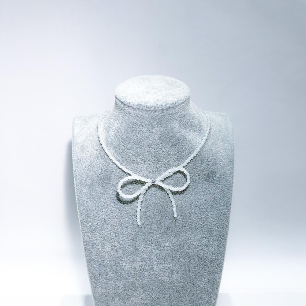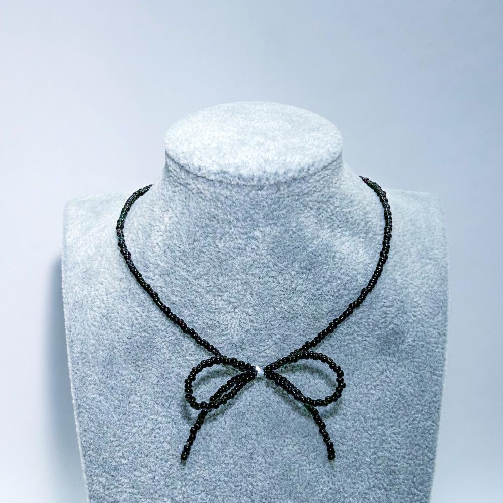 Elegant and playful, this handcrafted necklace features small, glossy black beads intricately strung into a delicate bow shape at the center. The design gives a charming ribbon-like illusion, perfect for adding a touch of whimsy and sophistication to any outfit. The necklace rests close to the collarbone, making it an ideal choice for layering or wearing as a statement piece on its own.