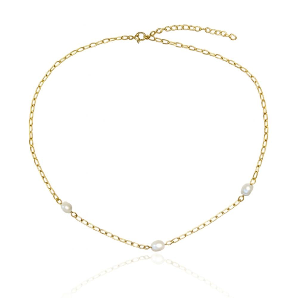 Elegant gold-plated chain necklace featuring three delicate freshwater pearls spaced along the design. Its minimalist style makes it perfect for layering or wearing alone, adding a touch of timeless sophistication to any outfit. Adjustable length for a comfortable fit.