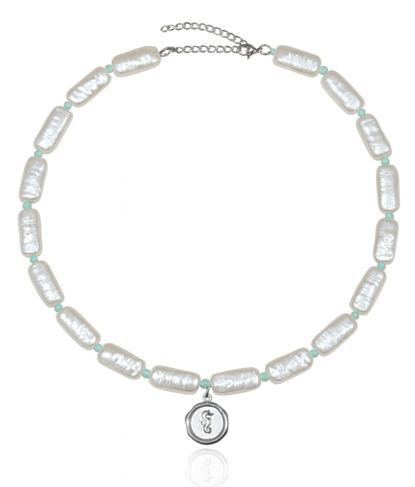 Bring a touch of ocean magic to your style with this seahorse pearl necklace. Designed with rectangular freshwater-style pearls accented by soft aqua beads, it’s finished with a silver medallion charm embossed with a graceful seahorse. A refined piece that blends timeless elegance with marine-inspired charm.