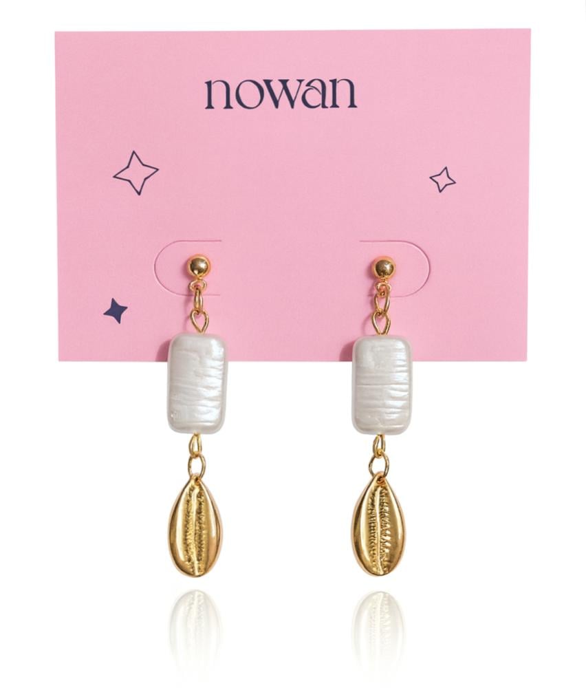 Elevate your seaside-inspired look with these elegant drop earrings. Designed with rectangular pearl-like beads paired with golden cowrie shell charms, they strike the perfect balance between natural beauty and timeless style. A refined accessory that adds a touch of coastal luxury to any outfit, whether casual or dressy.
