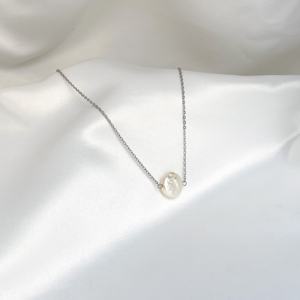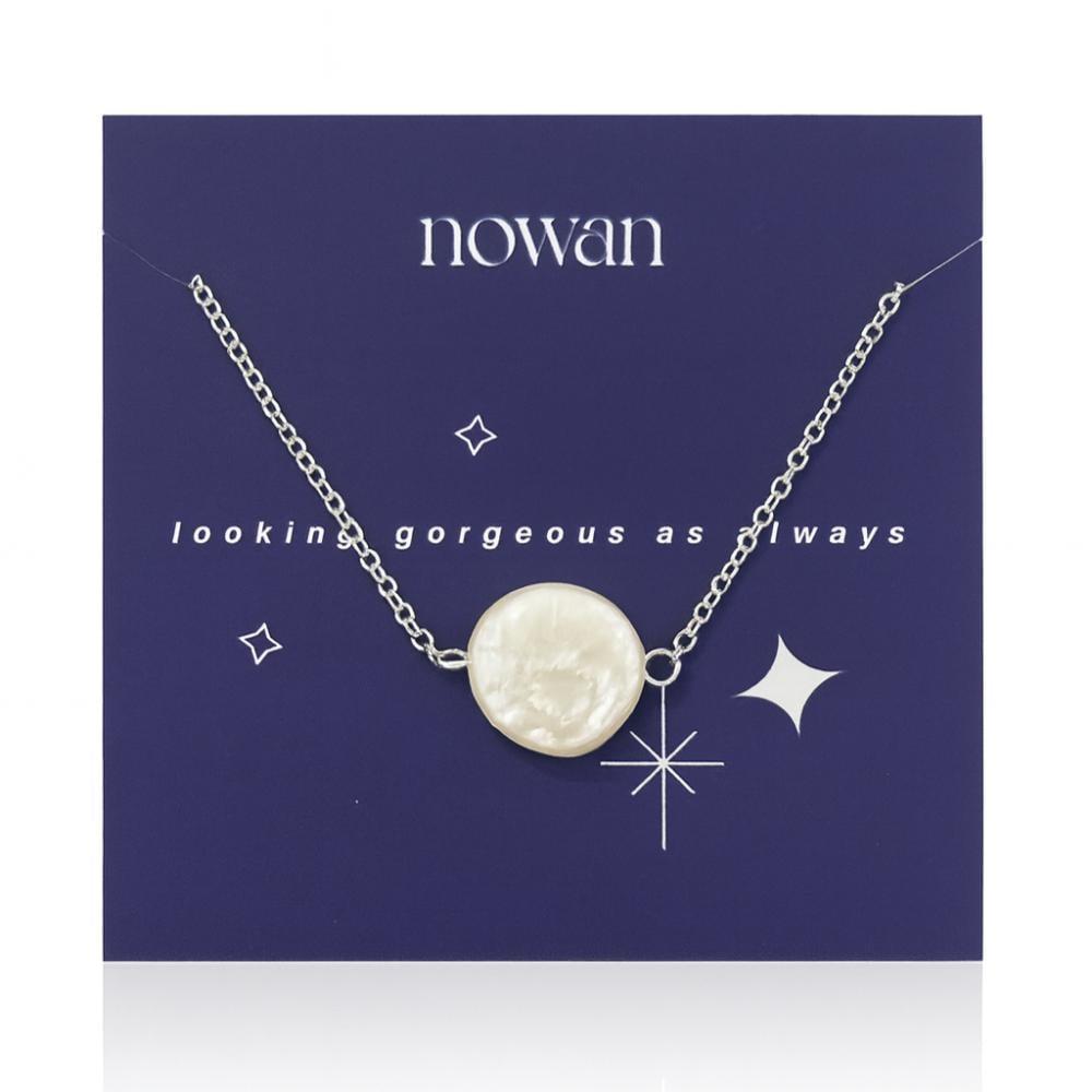 Radiate elegance with this mother-of-pearl coin necklace. Featuring a luminous round pearl-like pendant with natural textures, delicately set on a silver-toned chain, this piece captures the beauty of the sea in a timeless design. Its subtle shimmer and minimalist style make it perfect for both everyday wear and special occasions, adding a touch of sophistication and grace to any outfit.