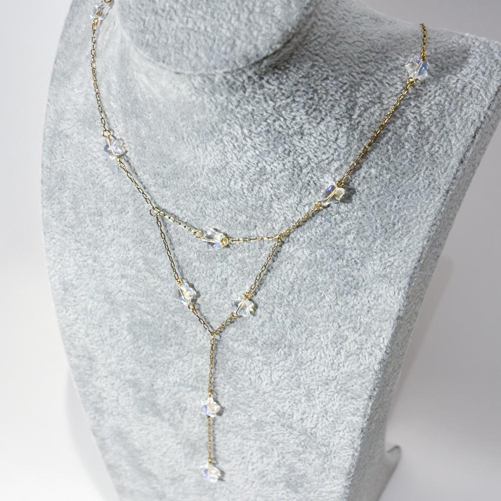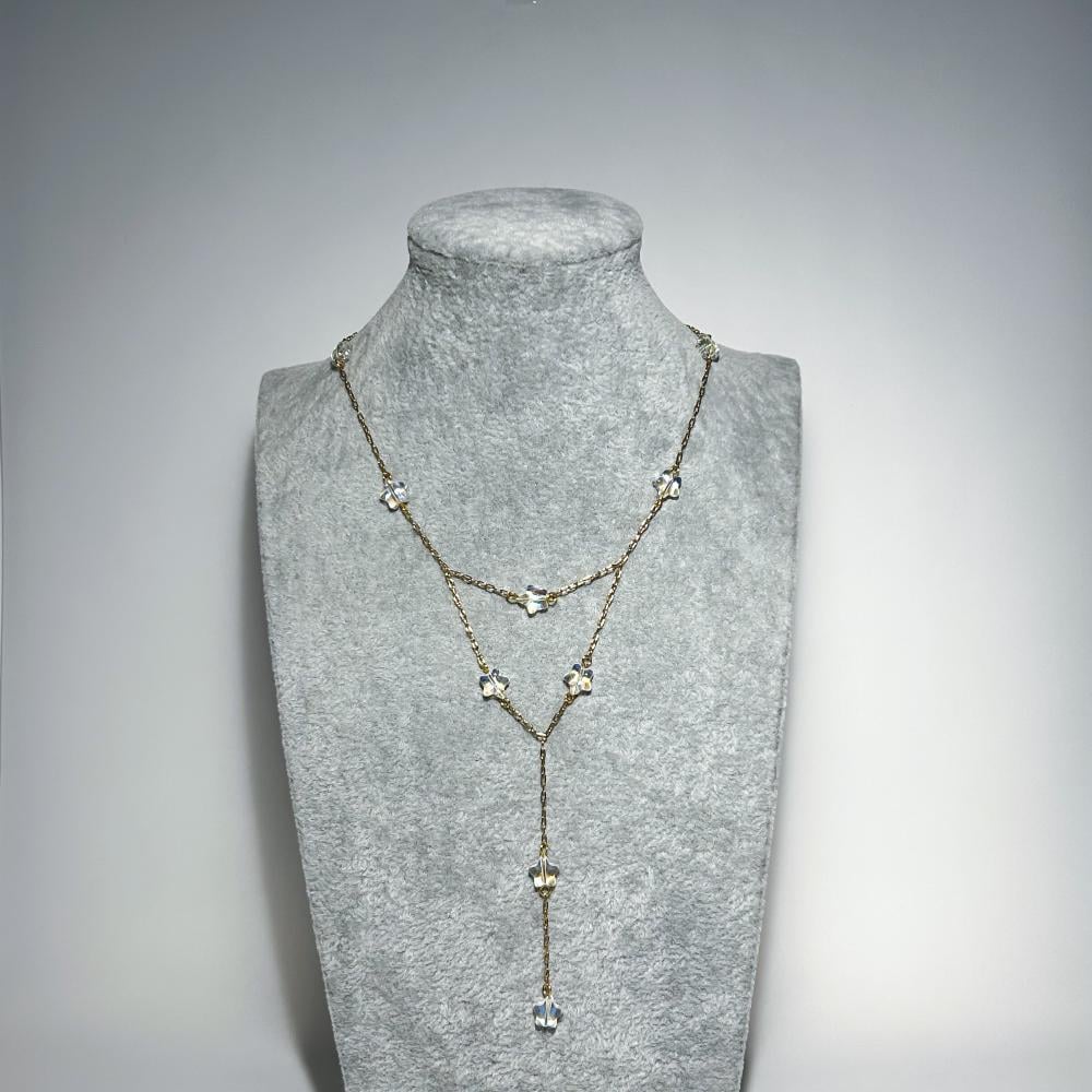 The Mouj collection draws its name from the Arabic word for “waves”, capturing the gentle rhythm and flowing elegance of the sea. Each necklace is crafted with delicate chains and crystals, stones, pearls, faceted beads that shimmer like sunlight on water. The layered design reflects harmony and movement, making it perfect for those who seek subtle sophistication and poetic charm. Available in soft pastels and classic tones, Mouj is an ode to serenity and femininity.