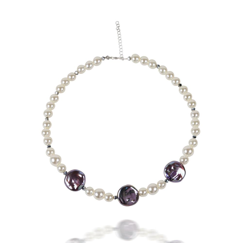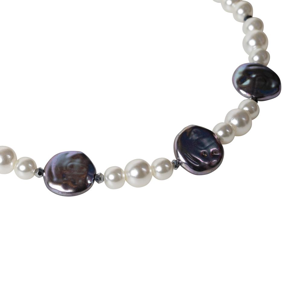 A statement choker necklace featuring a harmonious blend of elegance and bold design. It is crafted with lustrous round pearls, accented by three large, irregularly shaped metallic pearls with a reflective chrome finish. The contrasting textures create a contemporary yet timeless appeal, perfect for elevating both formal and trendy looks.