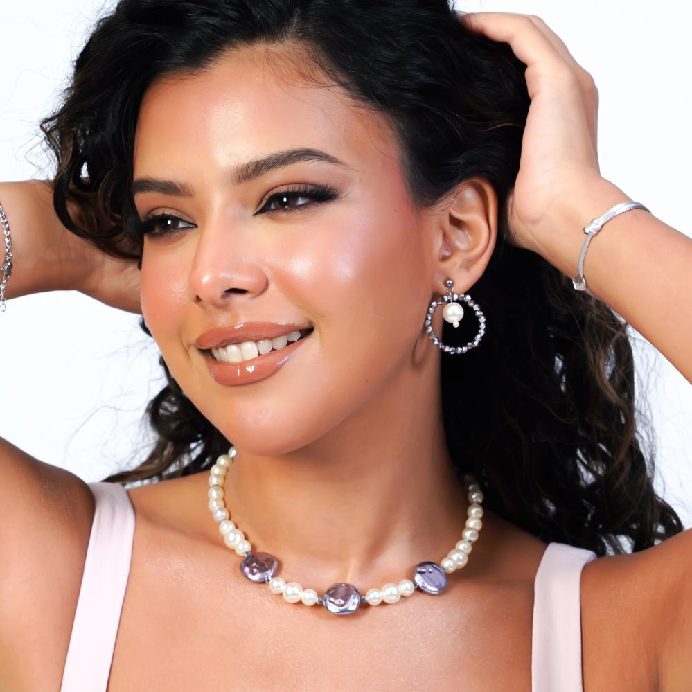 عقد تشوكر أنيق يدمج بين الفخامة والجرأة في التصميم. مصنوع من لؤلؤ دائري لامع، ومُزين بثلاث لؤلؤات معدنية كبيرة الشكل غير منتظمة بلمسة كروم عاكسة. التباين بين الخامات يمنح العقد طابعًا عصريًا وأنيقًا في آنٍ واحد، مما يجعله مثاليًا للإطلالات الرسمية والعصرية.