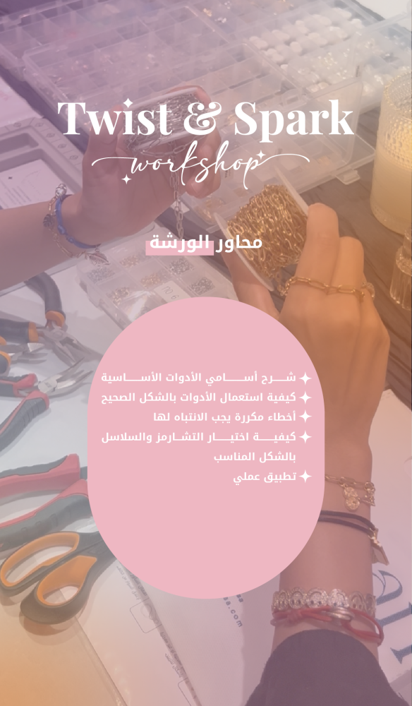 في هذه الورشة راح تتعلمين خطوة بخطوة كيف تصنعين قطعك الخاصة بأسلوب احترافي وبلمسة فنية فريدة، من اختيار الأدوات إلى تنفيذ أساورك الأولى بنفسك!