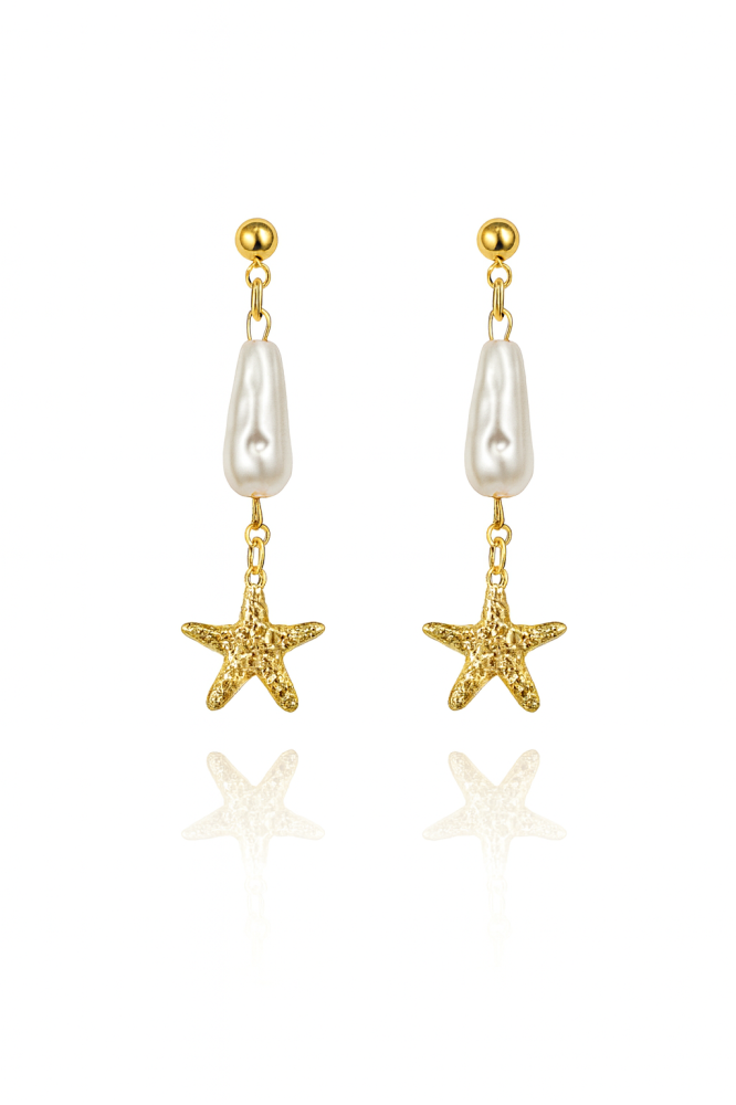 Add a touch of ocean-inspired elegance with these starfish drop earrings. Featuring lustrous baroque-style pearls paired with textured golden starfish charms, this design beautifully blends natural charm with timeless sophistication. Lightweight and versatile, they are perfect for elevating both casual and dressy looks, making them an essential piece for any jewellery collection.