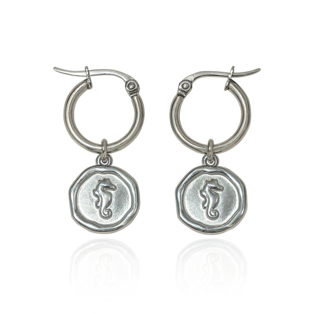 Dive into ocean-inspired elegance with these seahorse medallion hoop earrings. Featuring polished silver-toned hoops and round charms embossed with a graceful seahorse, they capture the mystical charm of the sea. A perfect accessory for those who love marine motifs and unique, statement-making jewelry.