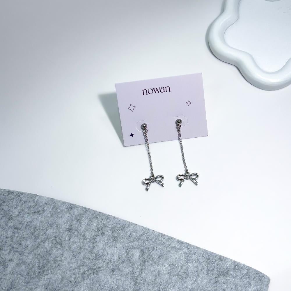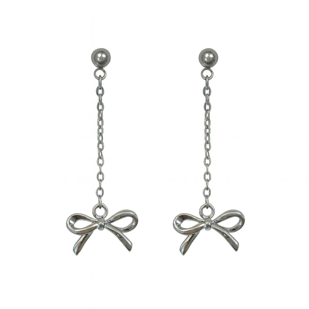 Delicate silver-tone dangle earrings featuring a charming bow pendant suspended from a fine chain — a sweet and elegant touch for any outfit.