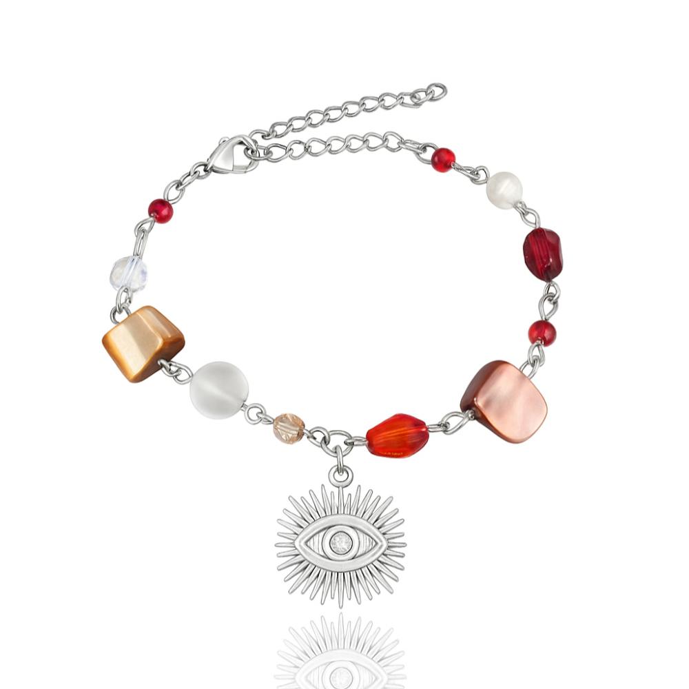 A bold and symbolic bracelet featuring a mix of red, amber, pearl, and clear beads, finished with a radiant silver eye charm. The vibrant colors bring warmth and energy, while the eye symbolizes protection and positivity—making it both a stylish and meaningful accessory for everyday wear.